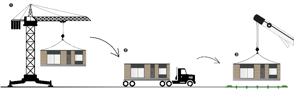- Sobald der Cube an seinem Ziel angekommen ist wird er behutsam auf die Schraubfundamente gesetzt, befestigt und noch an die Strom-,Wasser-, und Abwasseranschlüsse angeschlossen, danach ist bereit für den Einzug.